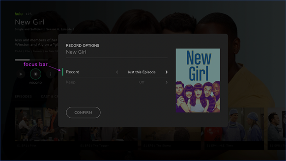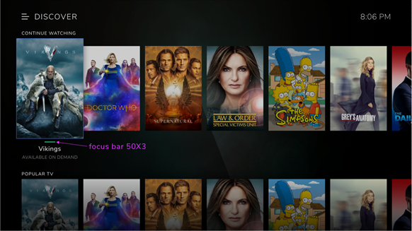 Focus in the OpenTV ION UI is partially denoted by either a horizontal or vertical bar as shown below. The color of this bar is configurable and, for the purposes of this section, is called the “focus color”. The size of focus bar is 50 x 3px.