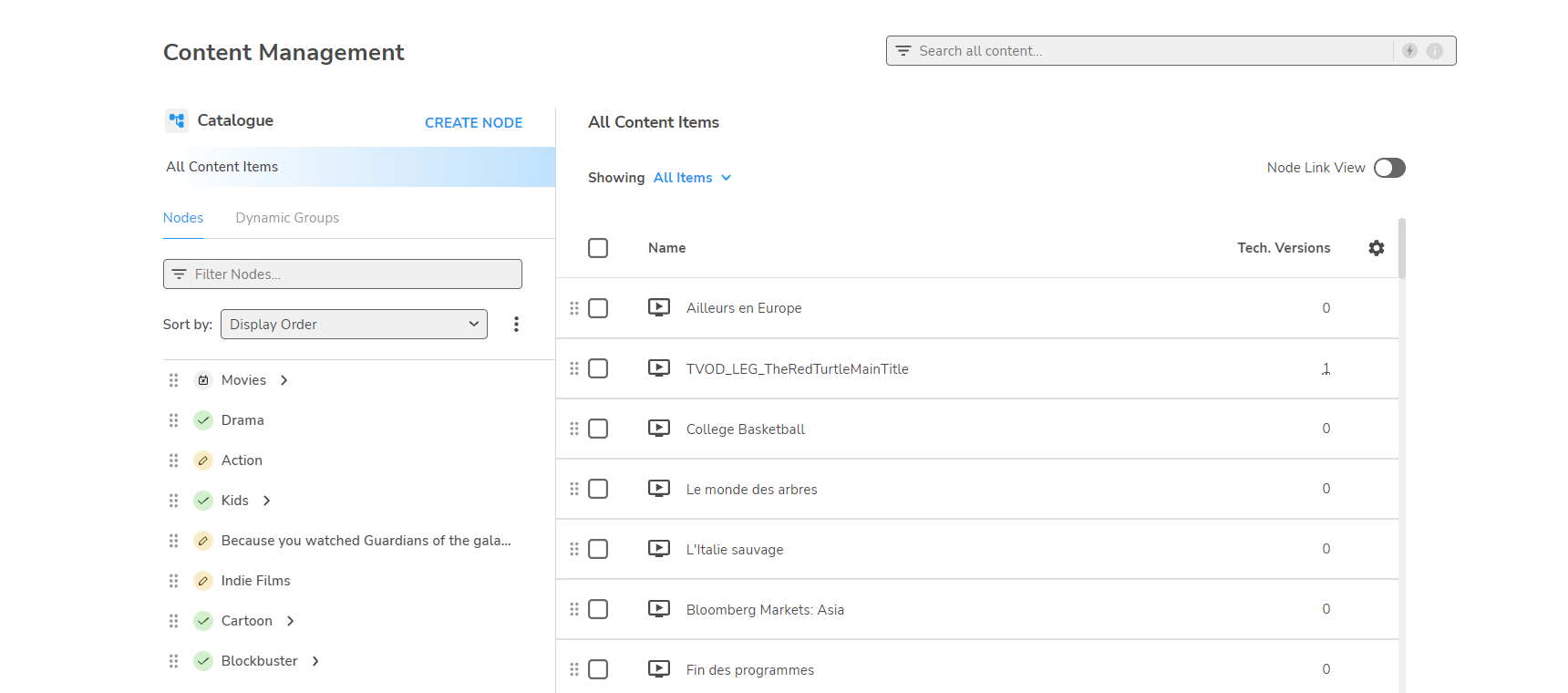 Content is displayed in the catalogue under nodes. These are configurable containers that you can create based on the type of content; for example, genre, trending, news and so on.