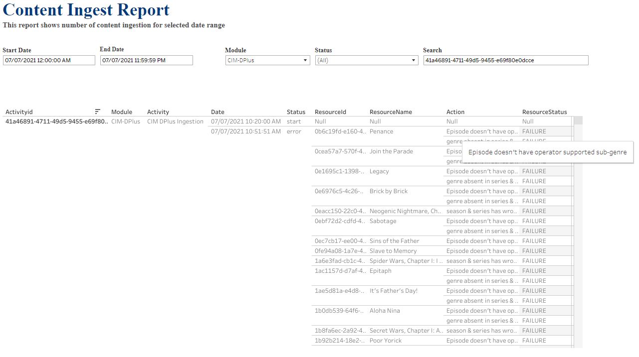 The Disney+ Ingestion Report contains a list of errors relating to the Disney+ items for which issues were encountered during the Disney+ ingestion cycle. The Disney+ Ingestion Report is available in Tableau. The operator can refer to the report and take action as necessary.