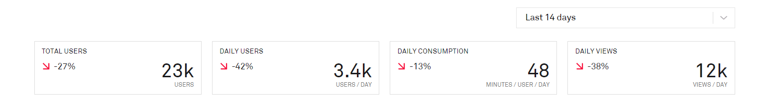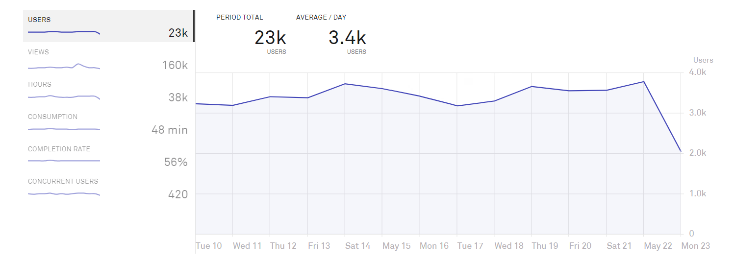 These charts show VOD performance broken down by users, views, hours, consumption, completion rate and concurrent users.