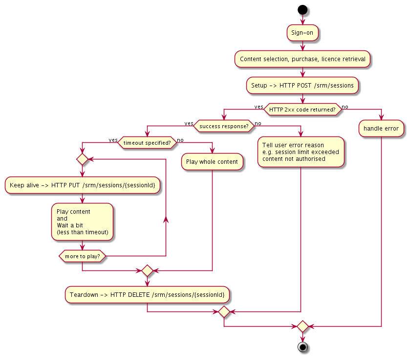 The client apps attempt to set-up a session for each new playback session, and the Session Resource Manager (SRM) enforces this limit. In addition, SRM offers an API for the operator to retrieve the existing sessions of a given customer account and tear-down an existing session at any time. The following diagram shows the simplified logical flow of the client application for the nominal use case.