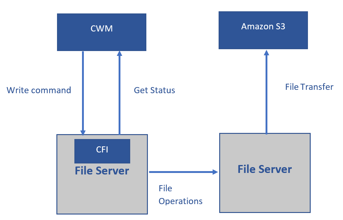 1. The Content Workflow Manager (CWM) generates an XML file containing the details of the file operation that the CFI is to perform. This XML command file is written into a directory that the CFI polls for commands that it is to execute.