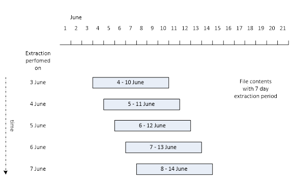 When triggered, the export algorithm will calculate a period of extraction based on an offset from the current date and time and a duration that are defined in the configuration file of the export. The target system should not make any assumptions about the period supplied in the file, for example they cannot assume the period is an exact multiple of 24 hours nor that the period is aligned to midnight.