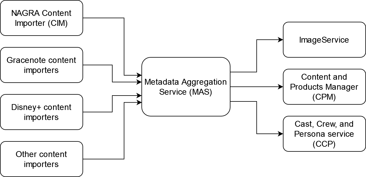 • You ingest XML containing metadata for various entities, along with image details for each entity, into the Content Importer (CIM-NIS – the CIM variant that supports the NAGRA Import Specification). The Metadata Aggregation Service (MAS) (an internal service) then routes the metadata as follows: